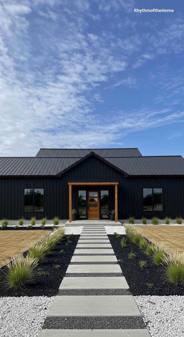 This barndominium embodies sleek, minimalist modernism. Its long, low-slung form is clad in black vertical siding with a matching black metal roof, creating a seamless and dramatic look. A single section of natural wood around the recessed entryway provides a warm and welcoming focal point. The landscaping is equally minimalist, with a walkway of separated concrete pavers set in black mulch, bordered by white gravel and ornamental grasses. This is a highly sophisticated and architecturally deliberate home, making a powerful statement with its clean lines and bold simplicity.