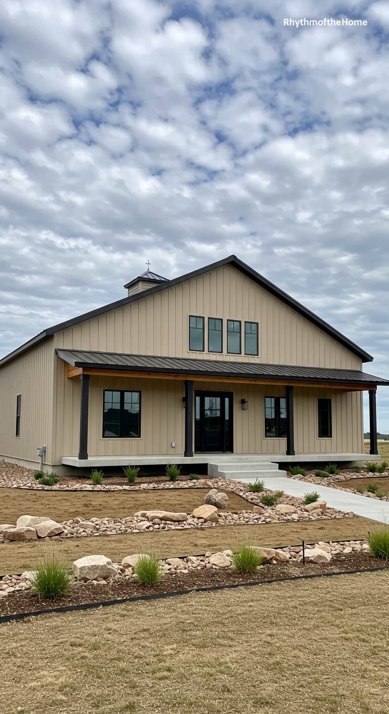 This barndominium has a clean, minimalist aesthetic with a warm and earthy color palette. The siding is a simple tan color, paired with a dark metal roof and dark trim. The porch posts are also dark, creating a cohesive and contemporary look. The front steps and walkway are made of simple, poured concrete. The landscaping is currently minimal, suggesting a new build, with small shrubs and rocks scattered across the graded earth. This home is a blank canvas of modern design, showcasing the beauty of simple forms and a neutral color scheme.