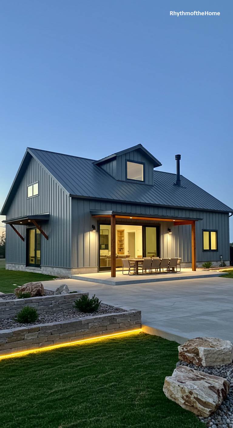 This barndominium is cleverly designed for seamless indoor-outdoor living. The gray metal-sided structure has a section where large sliding glass doors open completely to a covered patio, effectively removing the barrier between the interior dining area and the outside. At dusk, the warm interior lights and exterior accent lighting create a chic and inviting ambiance. The landscaping features illuminated retaining walls and carefully placed boulders, adding to the modern and sophisticated feel. This is a home built for entertaining and enjoying beautiful evenings in style.