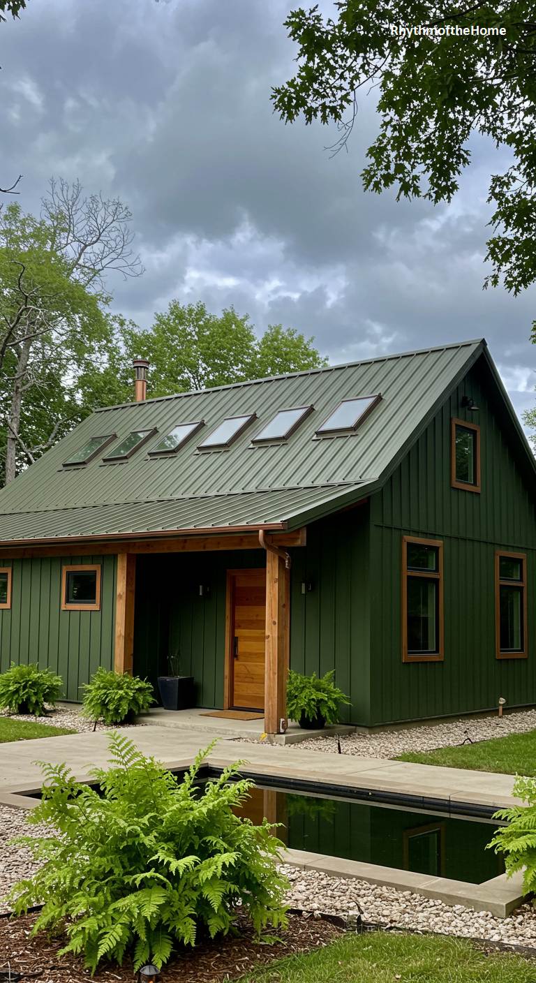 This barndominium has the cozy and secluded feel of a modern cabin in the woods. Its deep green vertical siding and matching metal roof help it blend into the lush, green surroundings. A series of skylights on the roof promises a bright interior. The warm wood of the front door and the porch posts provides a natural and welcoming contrast to the green siding. The landscaping includes a small, serene reflecting pool and is rich with ferns and other shade-loving plants, enhancing the feeling of a tranquil woodland retreat.
