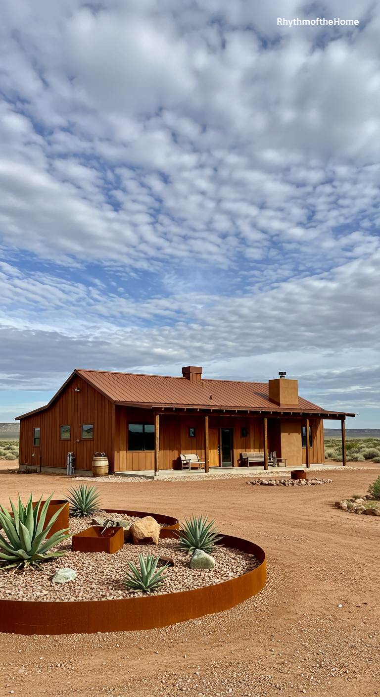 This sprawling ranch-style barndominium is perfectly at home in its wide-open desert setting. The earthy, terracotta-colored siding and roof blend beautifully with the reddish soil of the landscape. A long covered porch provides shade and a place to relax and take in the expansive views. The landscaping is natural and drought-tolerant, featuring large agave plants and a fire pit set within a large circle edged with rusted steel. This is a home that embraces its environment, offering a comfortable and stylish base for living in the beautiful, rugged desert.