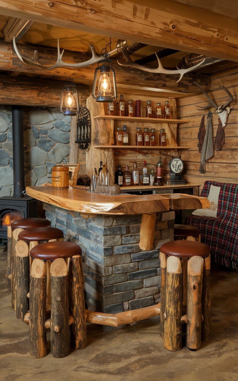 5. Cozy Mountain Cottage Themed Basement Bar