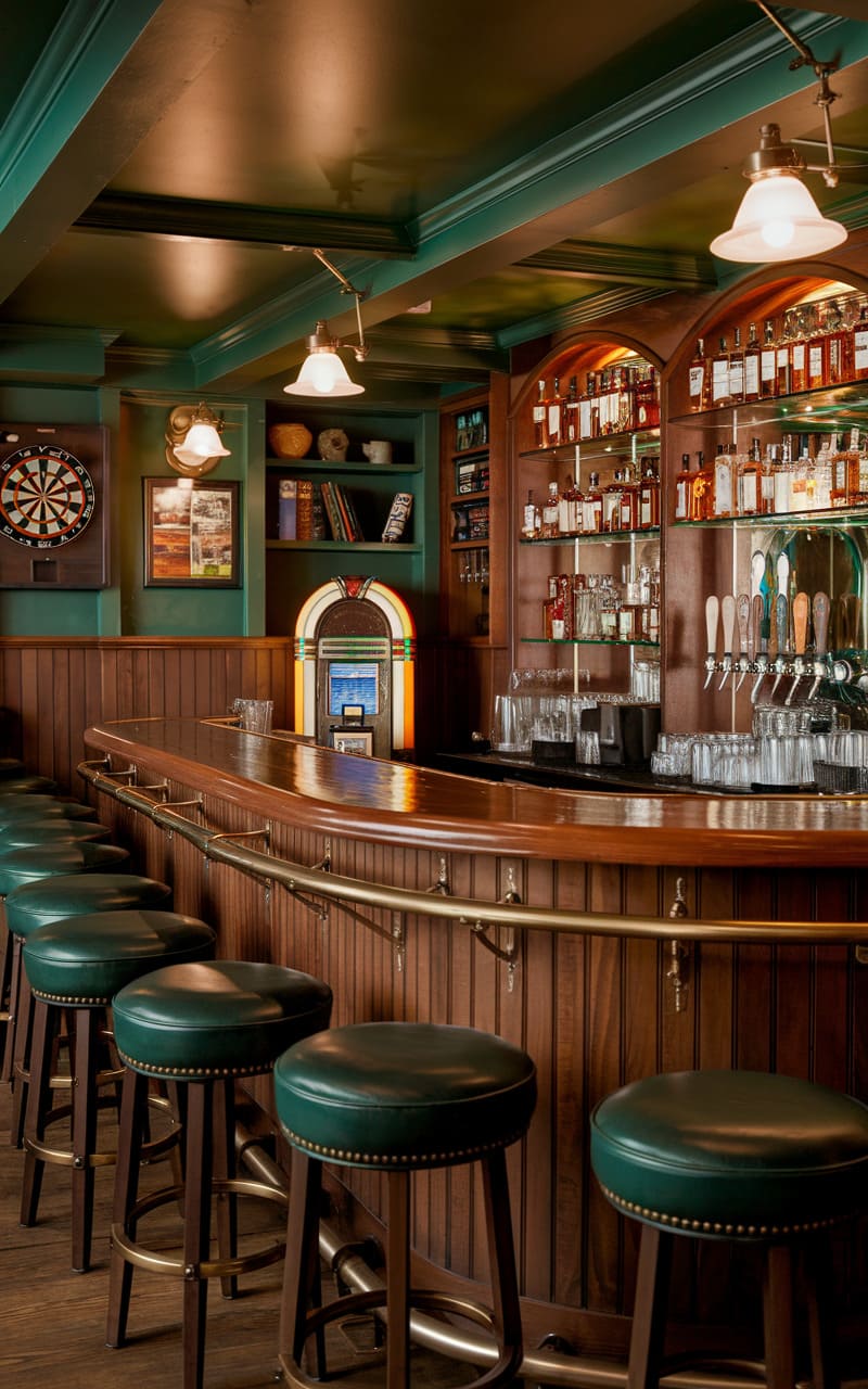 Recreate the cozy atmosphere of an Irish pub in your basement. Dark wood for the bar and paneling sets a traditional tone. Comfortable seating, maybe even small booths, invites lingering conversations. Irish beer or whiskey branding often features in the decor. Green accents and perhaps some Celtic motifs complete the theme. It feels warm, welcoming, and full of cheerful character.