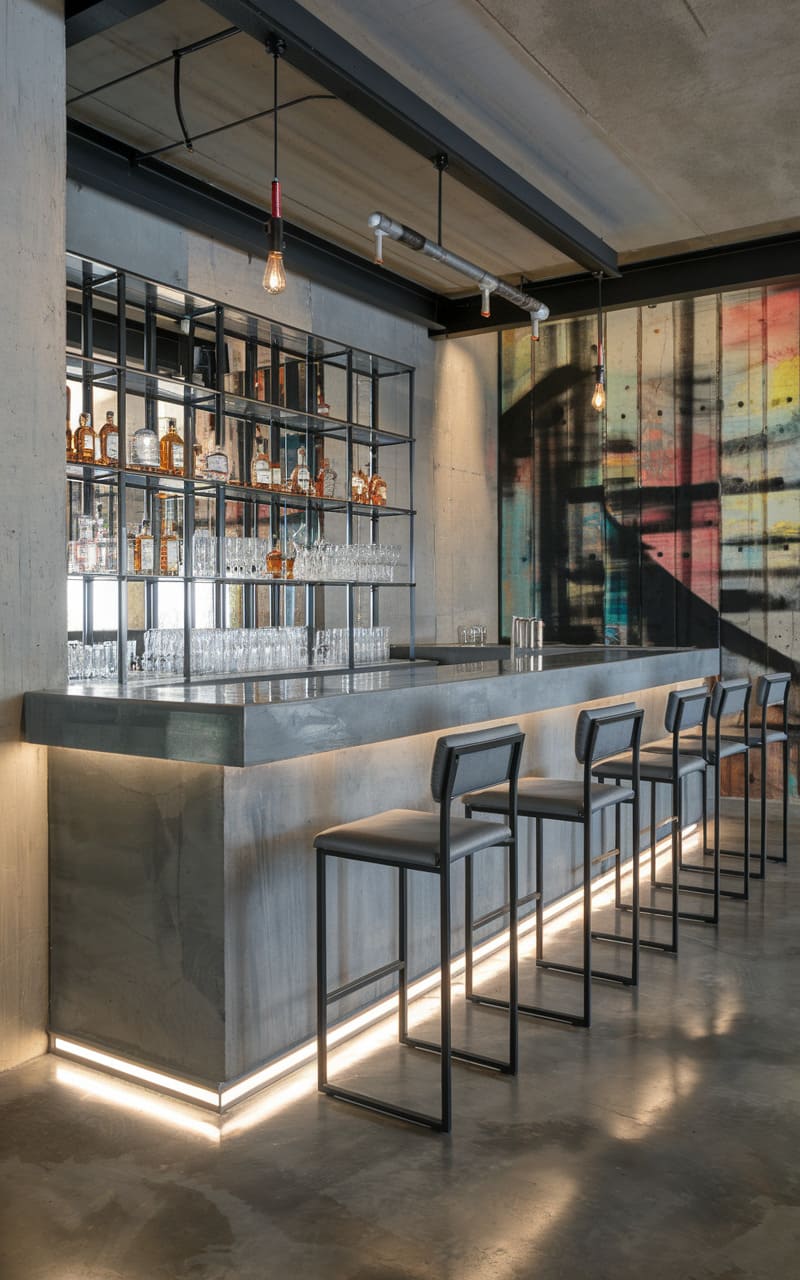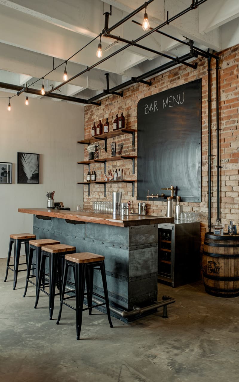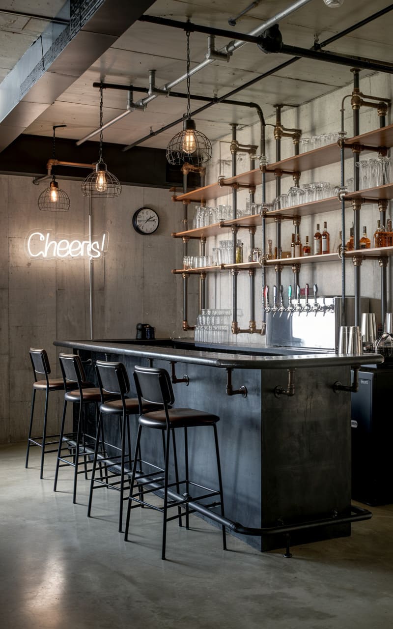 36. Sleek Industrial Basement Bar With Tall Ceiling