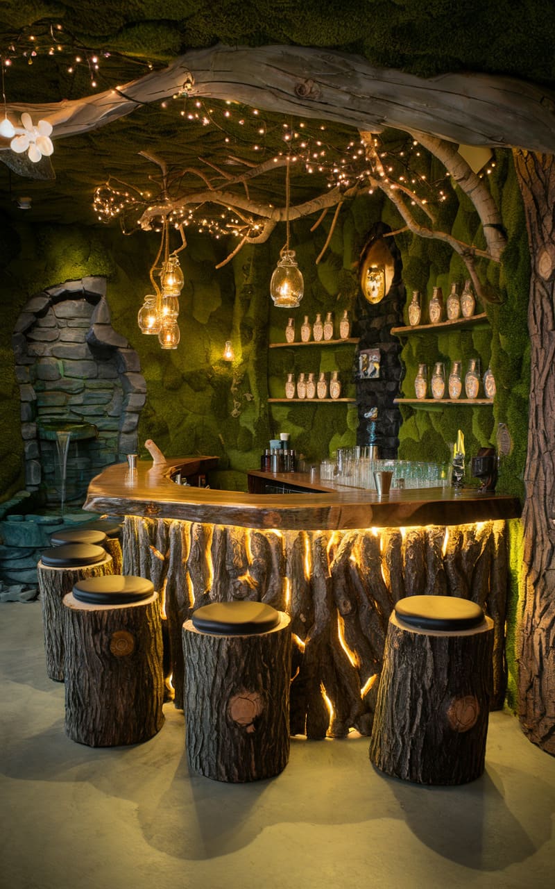 22. Whimsical Forest Themed Basement Bar