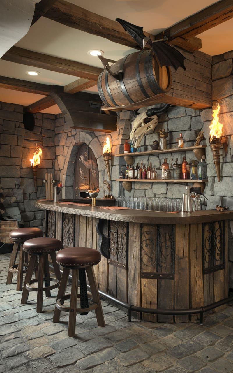 Journey back to Medieval times with this themed basement bar. Rough stone walls and heavy wooden beams create an authentic castle or tavern feel. Wrought iron fixtures and perhaps some faux torch lighting add to the ambiance. Decorative elements might include shields, crests, or tapestries. The furniture is typically sturdy and made of dark wood. This bar offers a fun, historical escape for guests.