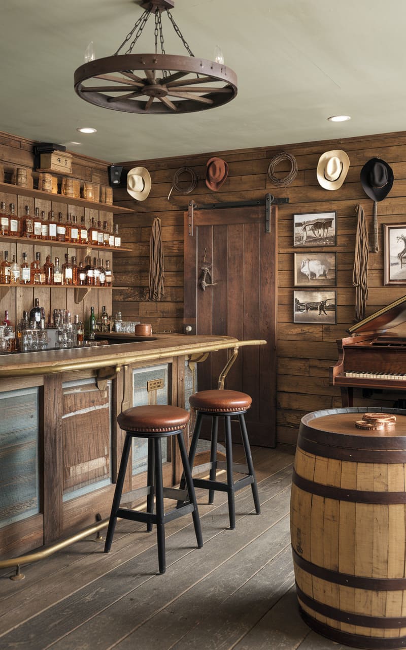 Transport yourself to the frontier with an Old West saloon themed bar. A rustic wood bar, perhaps with a brass foot rail, is the centerpiece. Decor often includes vintage signage, wanted posters, or cowboy memorabilia. The seating might consist of simple wooden stools or chairs. The overall feel is rugged, nostalgic, and a bit playful. This theme provides a fun and unique setting for gatherings.