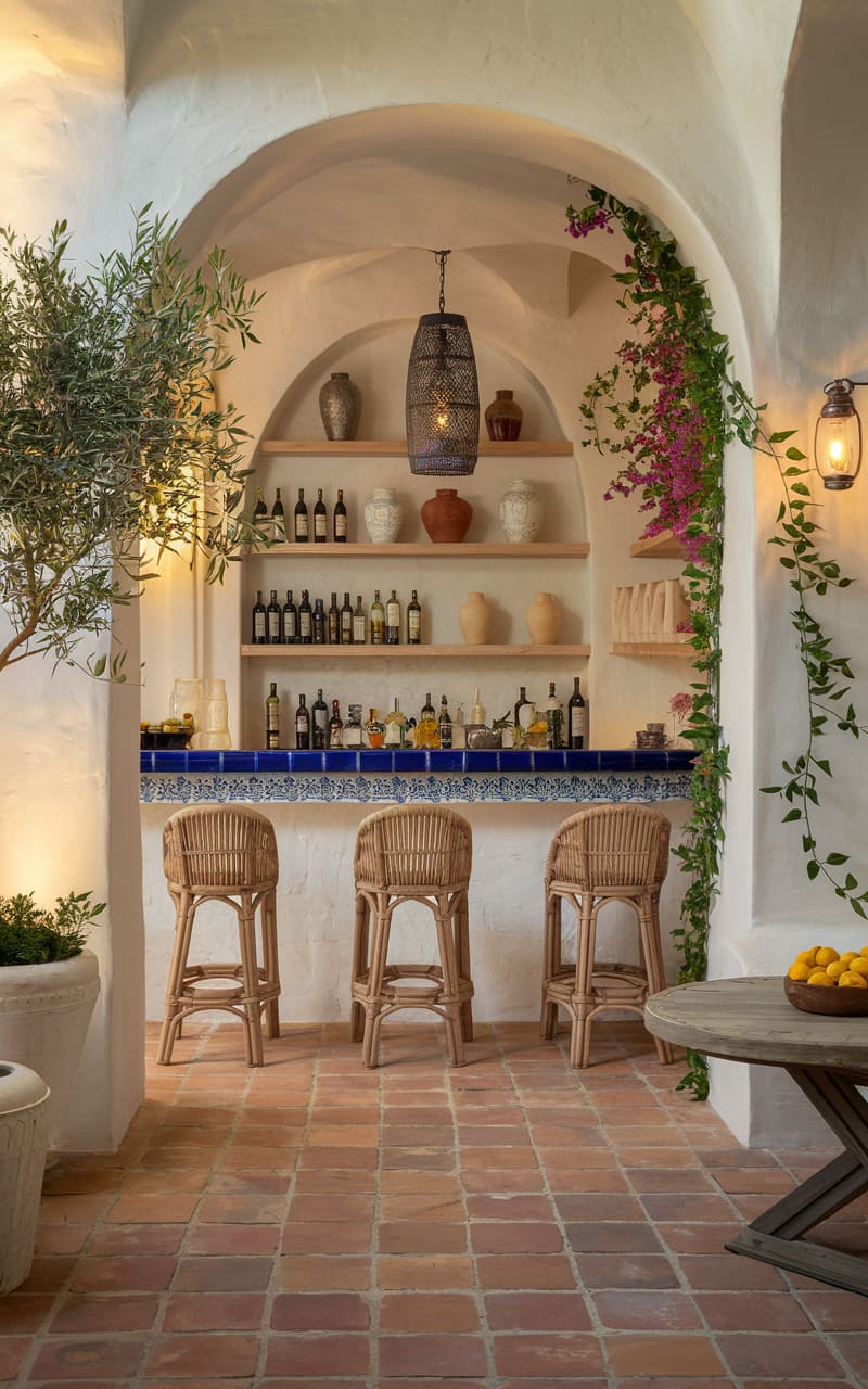 This basement bar transports you to the sunny Mediterranean coast. Warm terracotta tiles or accents are characteristic of this style. Features like arched niches for bottles add architectural interest. Wrought iron details might appear in lighting or bar stool legs. A color palette featuring blues, whites, and earthy tones completes the look. It feels relaxed, rustic, and full of old-world charm.