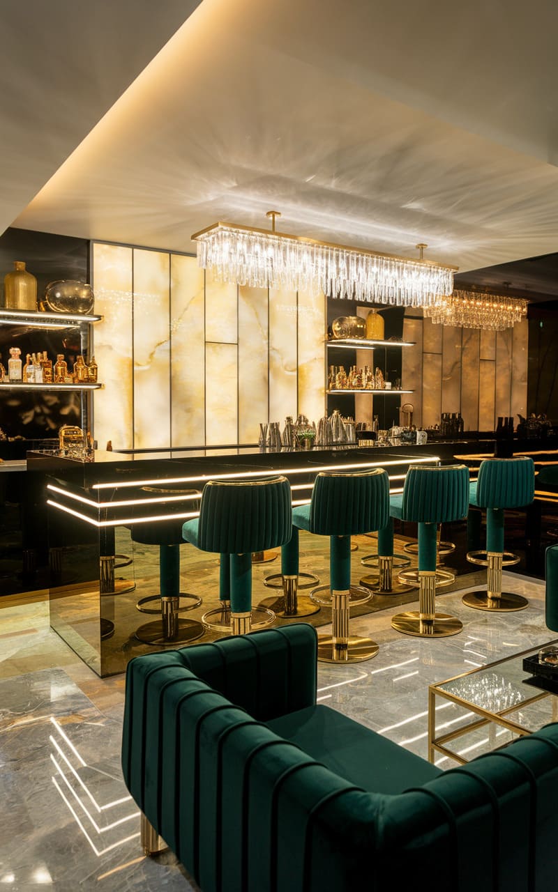 This bar represents an upscale take on the Art Deco style. Highly polished surfaces and luxurious materials like brass or chrome abound. Expect bold geometric patterns executed with precision and elegance. Dramatic lighting fixtures serve as stunning focal points. The color scheme is sophisticated, often featuring high contrast and metallic sheens. It is a truly glamorous and chic space for entertaining.