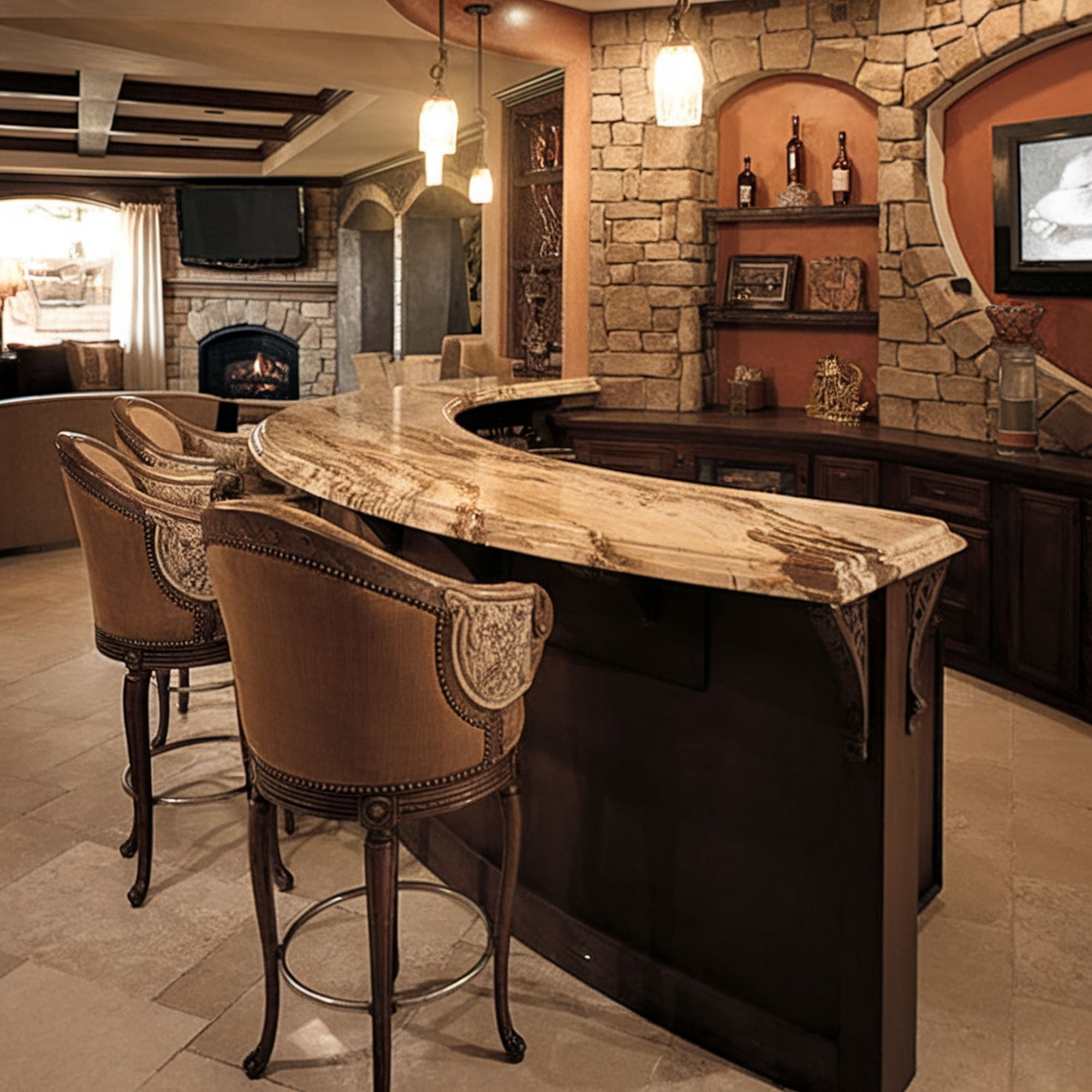 This basement bar captures the elegance of Old World design. Rich, dark wood with detailed craftsmanship is a defining feature. Classic furniture styles and luxurious fabrics add to the refined atmosphere. Warm, ambient lighting creates an inviting and sophisticated mood. The decor feels timeless, substantial, and beautifully established. It provides an elegant setting for sipping fine spirits or wine.