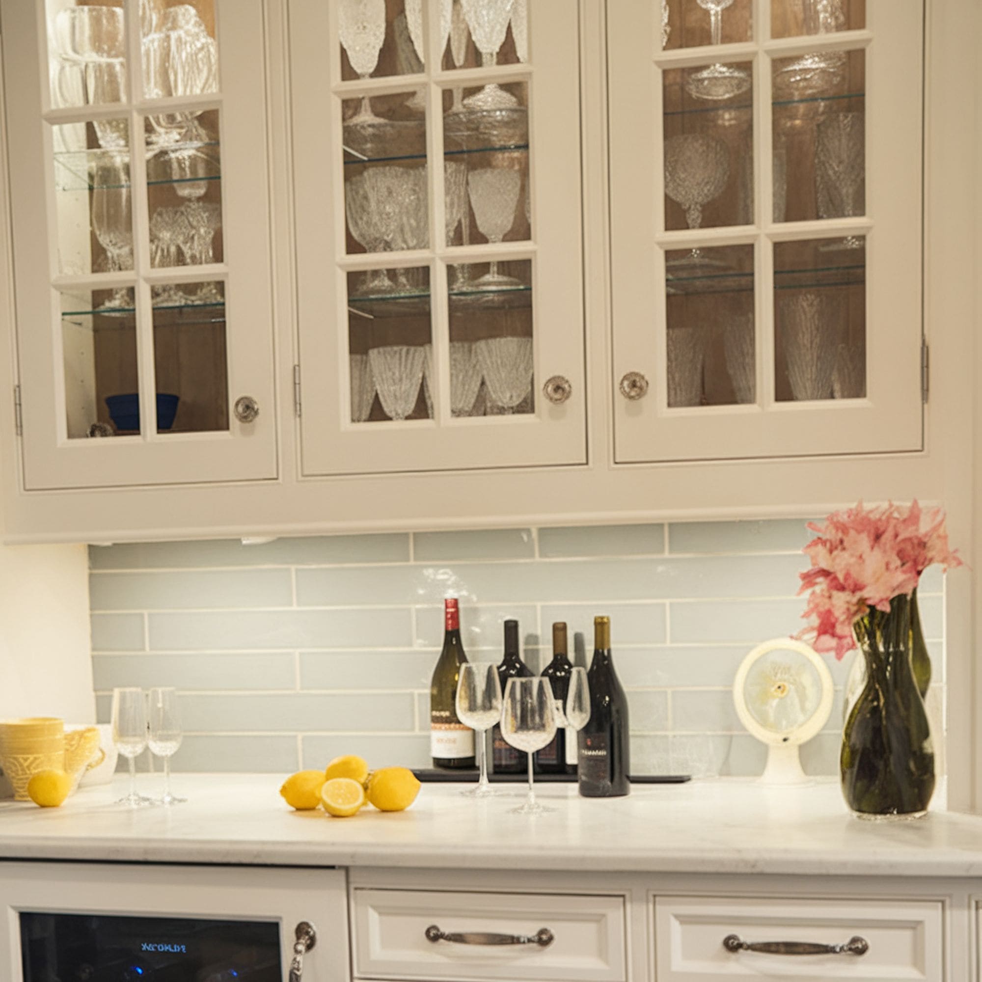 Finding a neat way to arrange drinks in your basement bar doesn’t get better than installing this custom cabinet. The way it displays all the glassware at the same time is impressive. The custom drawers and the way they hold the drinks are also beautiful. Another attractive thing you cannot miss is the white wood design, which oozes style.