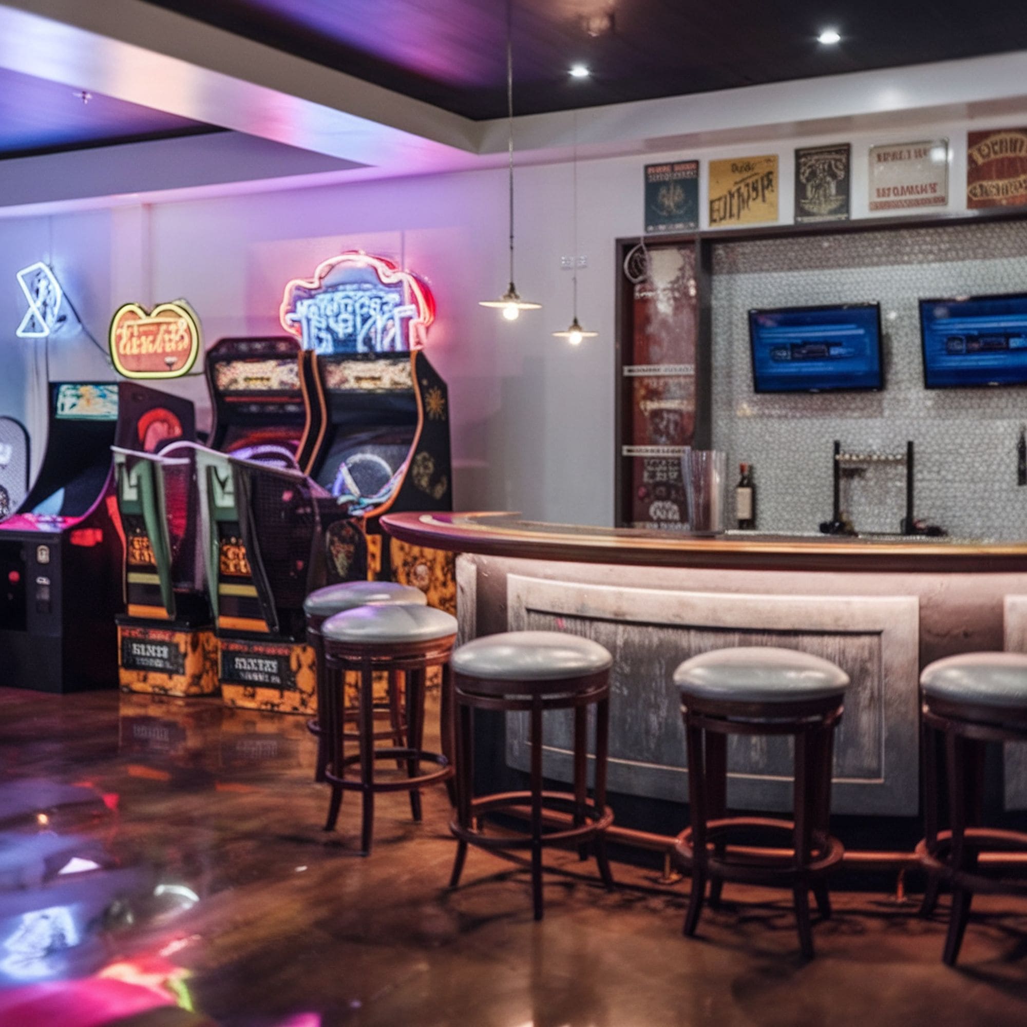 Step back into the vibrant 1980s with this retro themed bar. Neon colors and bold geometric shapes are hallmarks of this style. Decor might include vintage posters, cassette tapes, or even arcade game elements. Mirrored surfaces or chrome accents add to the flashy 80s aesthetic. The overall vibe is fun, energetic, and full of nostalgia. It is a playful theme perfect for parties.