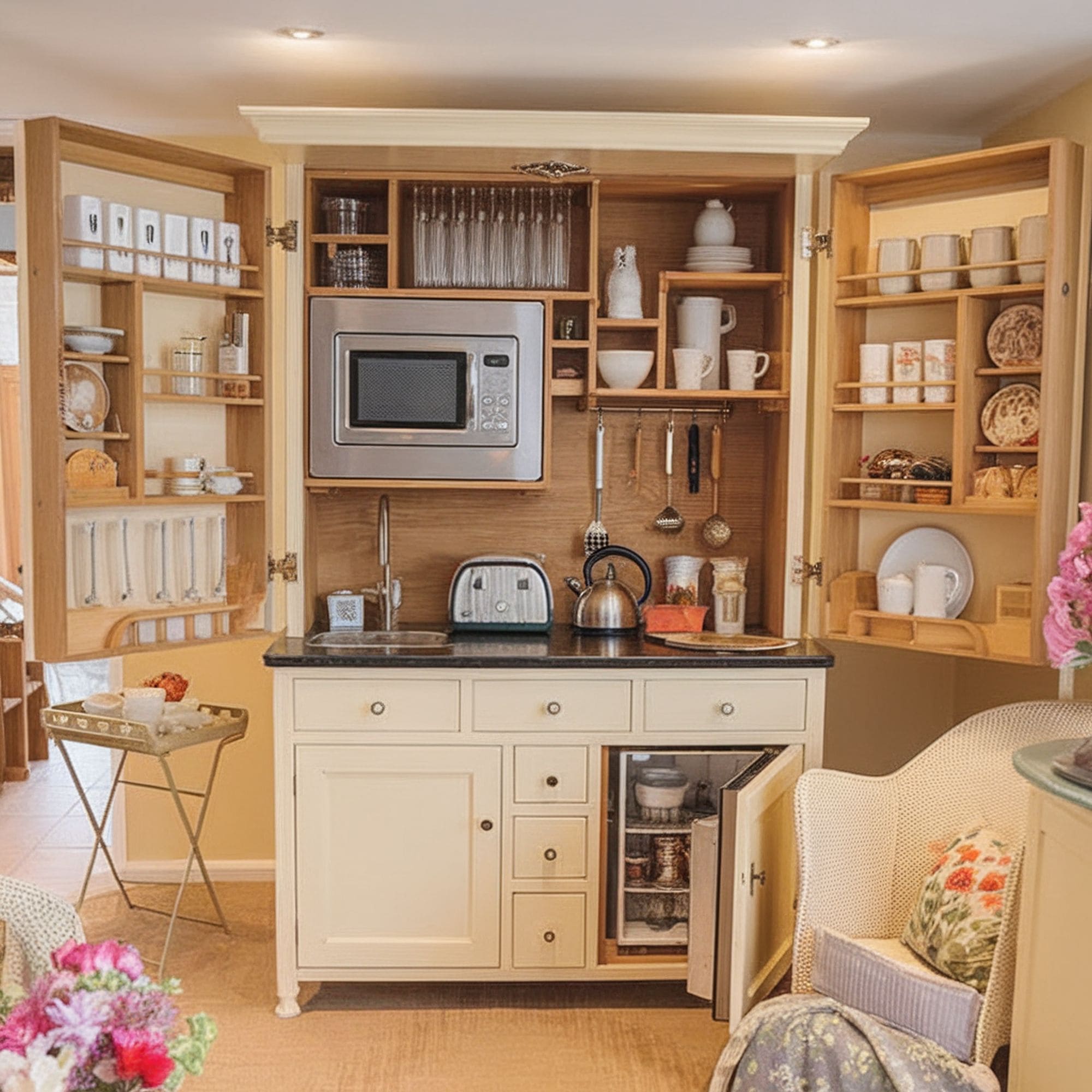 What you will find in the picture is a foldable kitchenette, but there is nothing that can stop you from replicating it in the form of a bar in your basement. You will need to add a few chairs in front to get the setting right. This is more convenient for a small bar at the corner.
