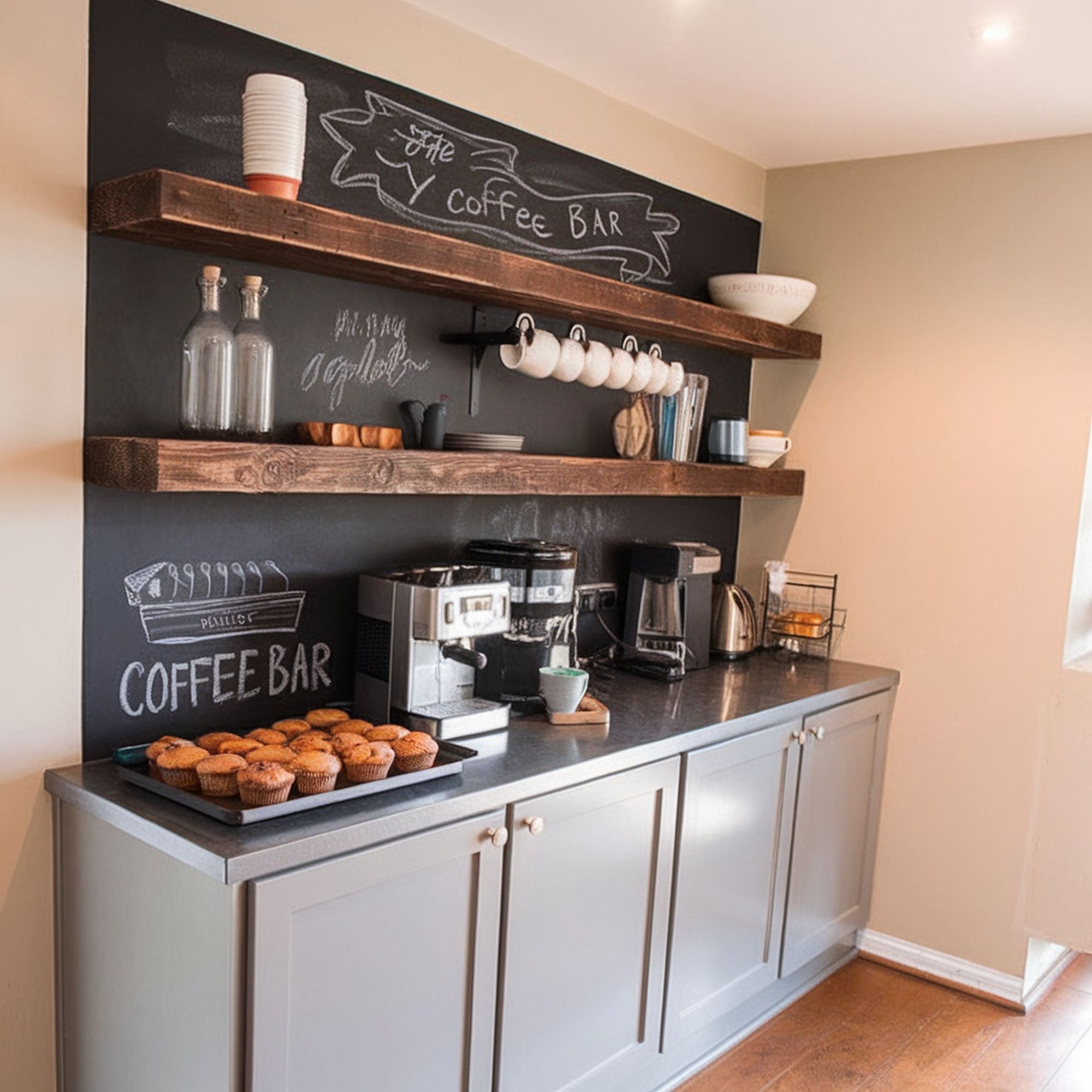 This setup functions as a convenient snack and drink station within the basement. It is designed to support other activities like movie watching or gaming. There is ample counter space for preparing snacks and pouring drinks. A mini-fridge keeps beverages chilled and easily accessible. Storage is included for glasses, bowls, and essential supplies. This practical station makes basement entertaining effortless.