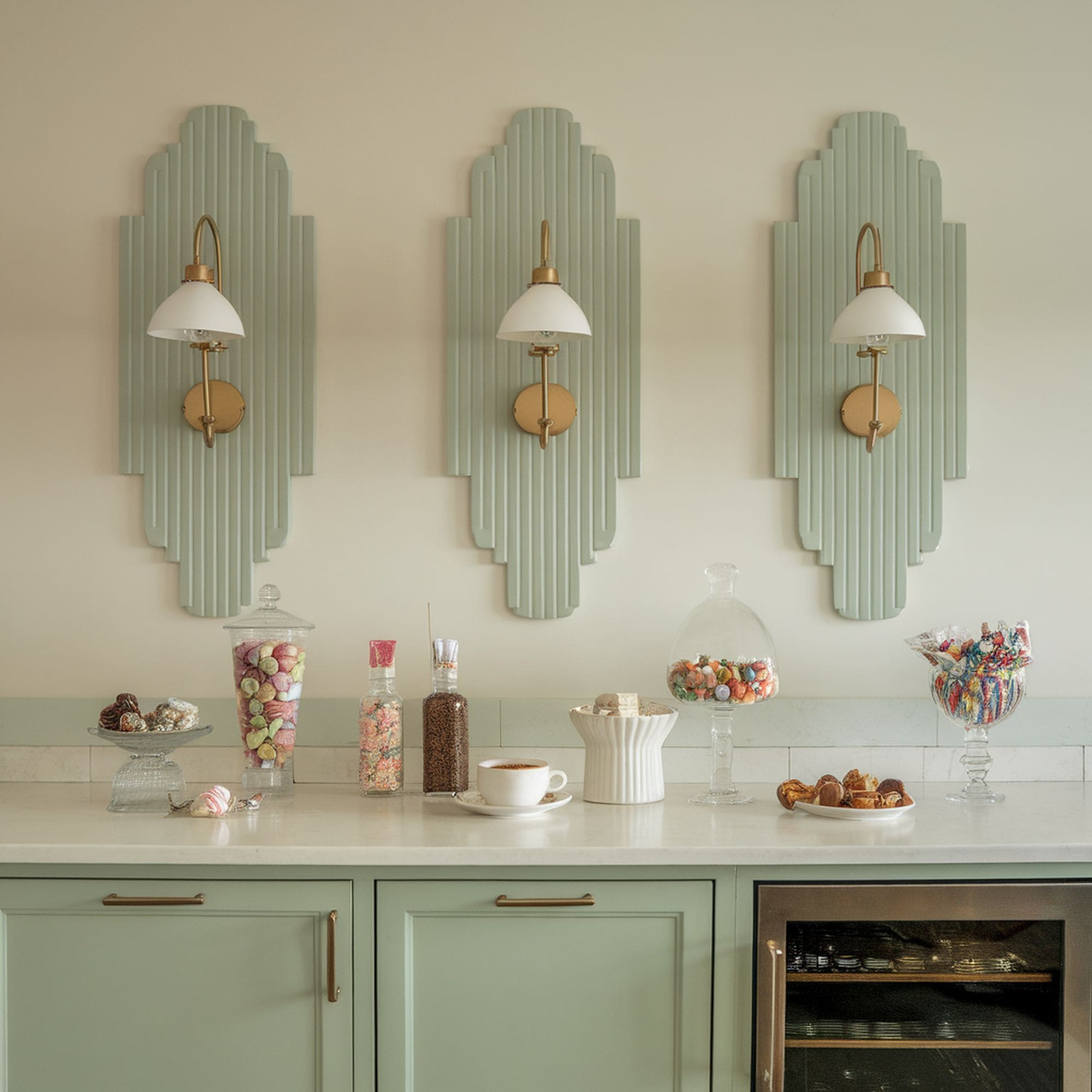 Have you ever considered the possibility of having a bar and a café down in your basement? Well, this is the design that makes it possible. The custom decorated wall sconces are cool, and the confectionaries add a bit of color to make the entire thing perfect.
