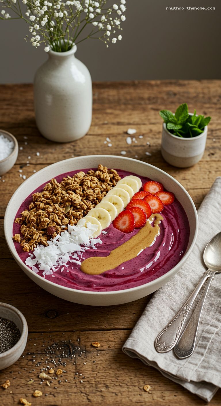 Place two serving bowls in the freezer for 5 minutes so the smoothie base stays thick. Slice half a banana and the fresh berries for topping. Measure out the granola, coconut flakes, and chia seeds so you can build the bowls quickly once blended.