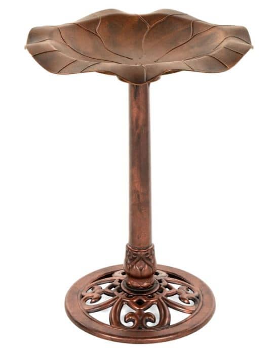 With a total water capacity of 0.78-gallon, this bird bath won’t require maintenance very often. Whether you choose to place it on the patio or in the garden, this model can contribute to an elegant atmosphere with its Fleur-de-Lys decorative accents. The Verdigris finish is both beautiful and functional as the resin should handle frost without problems. There are two color choices for this lily leaf pedestal bird bath – copper and green.