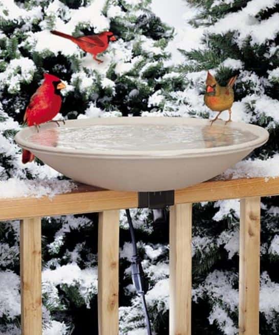 Most bird baths can only be used in the warmer season, but if you purchase a heated unit, you can prevent the water from freezing. Here’s a cost-effective model from Allied Precision Industries that features thermostatically controlled electrical heating. This is a great solution for the colder times of the year but keep in mind that this bird bath doesn’t include a stand or pedestal base.