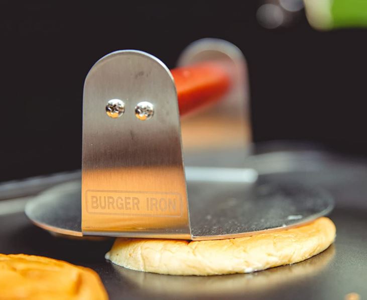If you want a crispy gourmet burger experience in the comfort of your backyard, consider getting the Burger Iron press. This tool is designed for making smash-burgers with an extra crispy flavor comparable to famous hamburger joints. It’s made from stainless steel and features a round design optimized for pressing burgers directly on the griddle surface or skillet. You can easily take your grill game to a new level.
