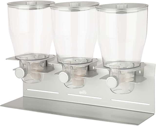 One of the problems some people encounter with cereal dispensers is the space they take up. One way around this problem is having a wall-mounted dispenser. The Zevro smart space dispenser mounts easily to your wall with either screws or heavy-duty foam tape. It can hold 3 different types of cereal and conveniently dispenses 1 ounce at a time. The tight-fitting lid is designed to keep contents fresh for up to 45 days. As an added feature this dispenser has a detachable measuring cup for quick measuring.