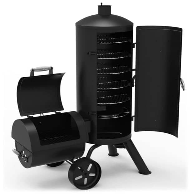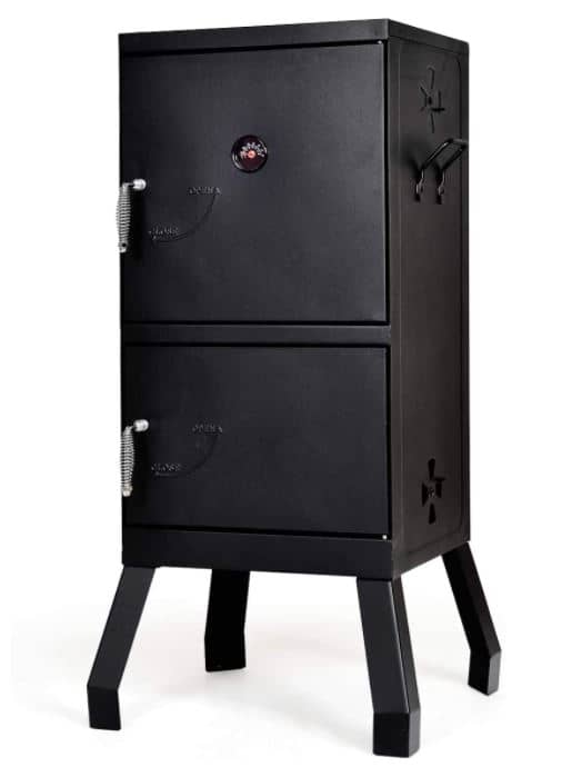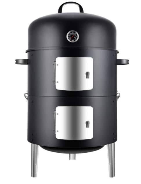 Charcoal smoking can bring some hidden depths of flavor to any outdoor backyard party. Take a look at this vertical two-tier model made by Giantex if you’re interested in this type of grilling equipment. It’s a recommended unit for large gatherings considering the generous capacity of its nettings. For added safety and convenience, this model features two doors so you can check the food separately from the fuel source.