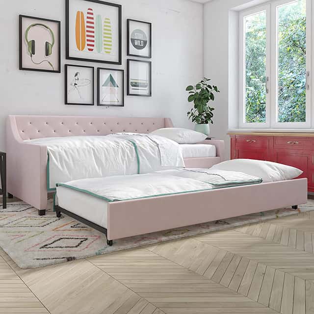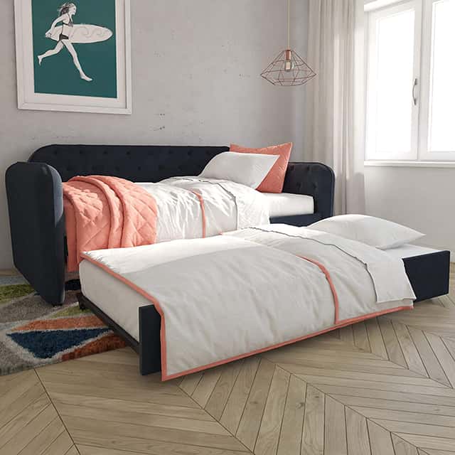 Another stylish Novogratz daybed, the Tallulah collection has all it takes to become a favorite among those with more generous budgets. This daybed stands out compared to others thanks to its retro silhouette with elegant curves as well as the luxurious velvet upholstery. Take your pick between stunning shades of blue, pink, or gray. Button-tufted details contribute to the overall impressive design.