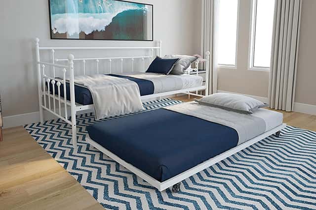 One great feature of this daybed is the addition of strong slats to increase long-term durability. The trundle is equipped with caster wheels of which two can be conveniently locked as needed. Whether for guests or kids, this metal daybed frame is versatile enough to create various sleeping arrangements in great comfort. The assembly process is not very complicated so the DHP Manila daybed is highly recommended for the money.