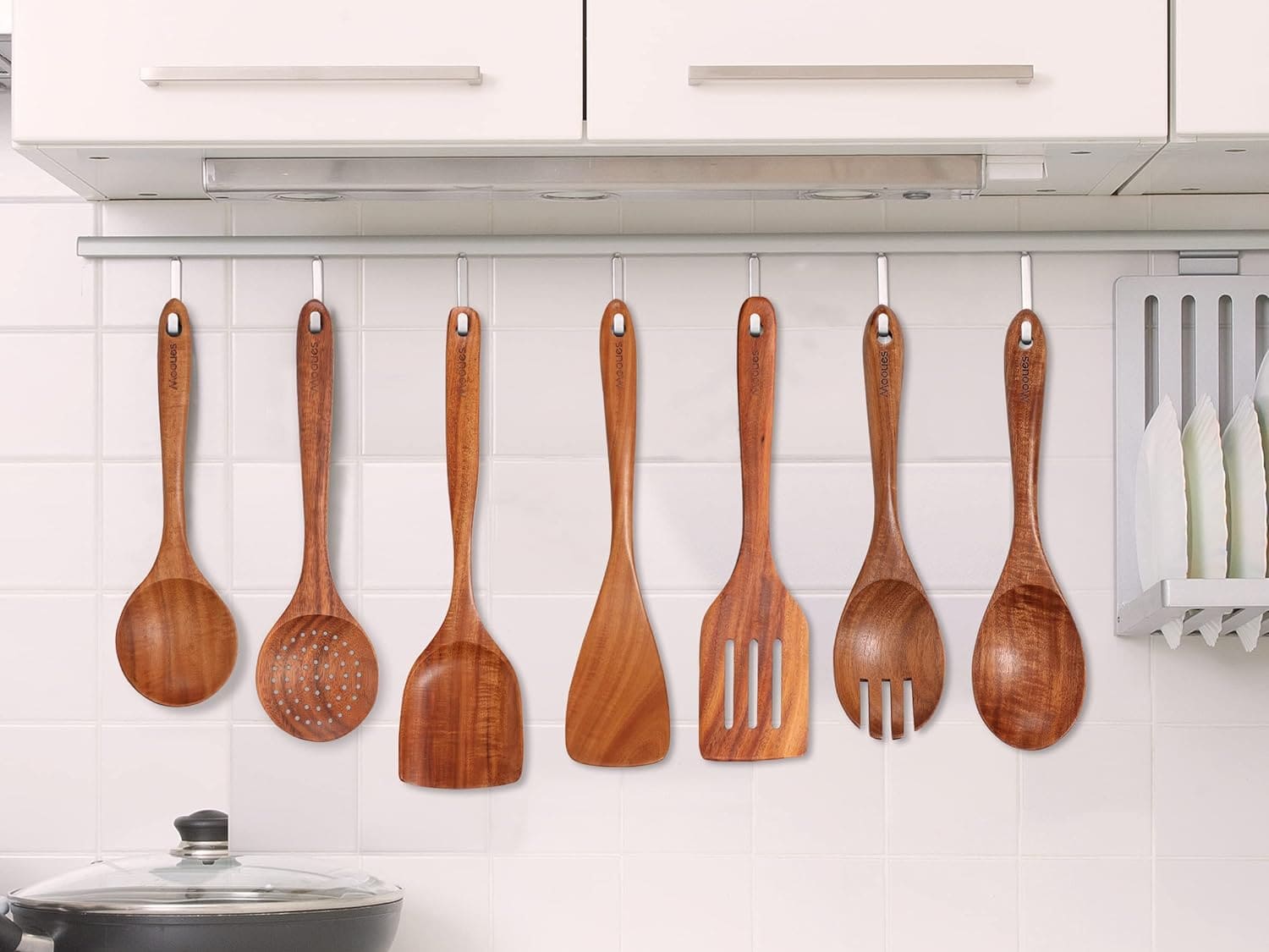 Exceptional value and durability define this 9-piece wooden utensil set. Crafted from premium teak wood, known for its exceptional hardness and resistance to cracking, these utensils offer superior longevity compared to silicone or bamboo alternatives. The set thoughtfully includes a spoon rest and a holder with a leak hole, ensuring your workspace remains clean and organized. Each utensil is meticulously sanded for a smooth finish, protecting your cookware while providing comfortable handling. Easy to clean and designed for convenient storage with hanging holes, this set is a must-have for any kitchen.