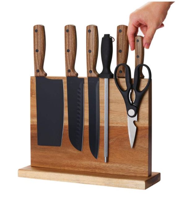 There are many practical solutions when it comes to storing your kitchen knives. Check out the LK-Outdoor Articles magnetic block that stands out compared to other similar accessories. It incorporates a strong magnet inside solid wood construction to keep rustic aesthetics without compromising on functionality. The magnetic block offers double-sided suction performance for extra flexibility allowing you to add more knives.