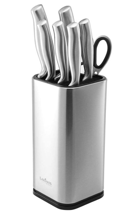 Inexpensive and stylish, the universal knife block by Laxinis deserves a mention on our list of the best knife storage solutions for the money. This is a suitable choice if you prefer a modern design and don’t have a particularly large knife collection. Thanks to its smart space-saving construction, this knife block won’t feel like cluttering up the countertop. Despite the reduced cost, the knife block feels durable and solid.