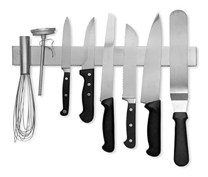 Anyone who wants a practical, space-saving knife storage solution needs to consider the Modern Innovations magnetic bar. It’s not particularly difficult to install while offering a length of 16 inches to attach your kitchen knife collection. The metal strip relies on high-quality stainless steel while the strong magnets ensure that your cutting tools stay firmly connected. It’s a heavy-duty rack that keeps knives securely in position.