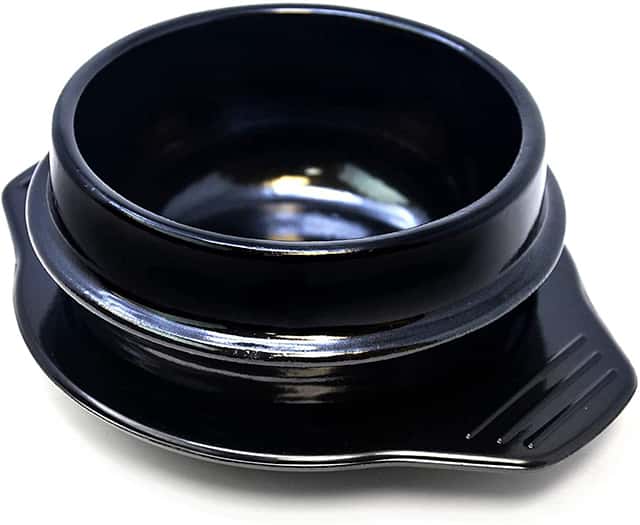 If you’re looking for a well-designed dolsot, check out this stone bowl made by Crazy Korean. It’s available in two different dimensions, depending on your preferred dish size. The cooking bowl can also be purchased with or without a lid. Thanks to its premium ceramic construction, this model delivers excellent thermal resistance and provides solid compatibility with various appliances, including microwaves.