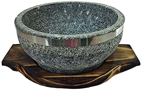 The Sunrise Kitchen Supply stone bowl is a recommended option for any fan of Korean cuisine. This model offers lots of benefits if you’re looking to serve sizzling hot food in style. It works flawlessly for rice dishes but you can also count on it for stews and soups. Thanks to its wood underline, the stone bowl is safer to use and there’s no risk of furniture damage.
