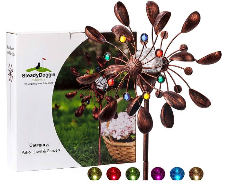 Wind spinners work very nicely to decorate your lawn. Check out this model from SteadyDoggie that incorporates solar LED lighting with a charming antique bronze construction. It’s more than just a basic wind spinner because it has great potential to attract attention in your garden during the day and at night as well. The LEDs offer a pleasant ambient light in multiple colorful tones that shouldn’t appear too distracting.