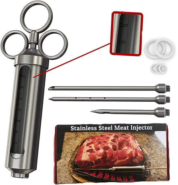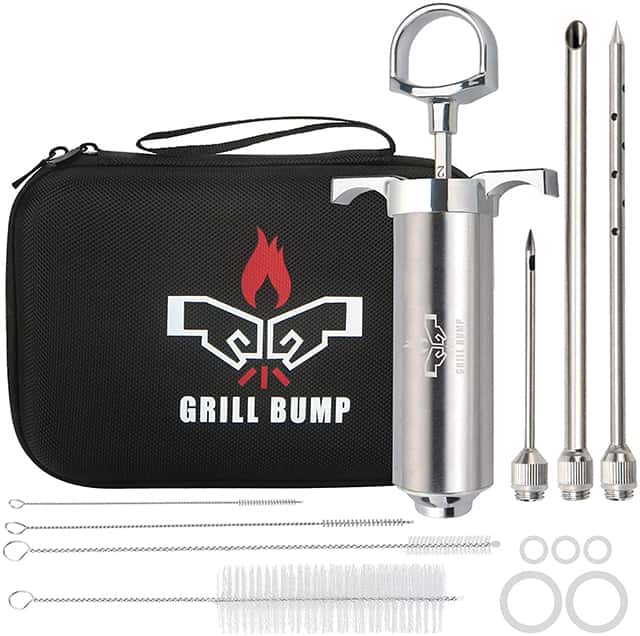 The Grill Bump meat injector is one of the top meat injectors. It is made of 304 stainless steel, has 3 needles with varying openings for injecting different meats, spare silicone rings, and cleaning brushes for every component. To top it all off they all fit into a neat carrying case. The syringe can hold up to 2 ounces of marinade at a time, while the needles are sharp enough to puncture even the toughest cuts of meat. This is the kind of meat injector you want on your side because it will get the job done again and again.
