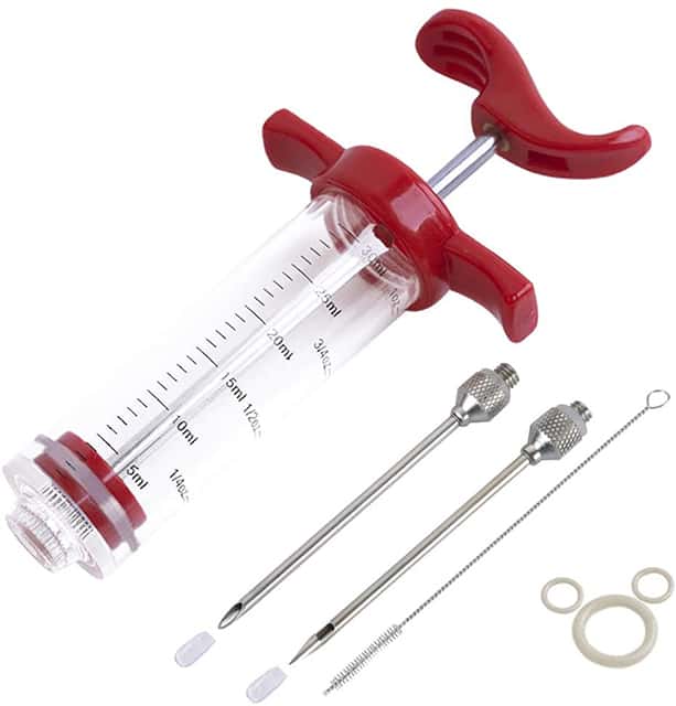 This is when the SpitJack magnum meat injector comes in. This injector’s longest need is 5.5 inches. This makes it ideal for flavoring large cuts. It also comes with 3 additional needles, cleaning tools, and a convenient carrying case. This injector also features a trigger handle that can apply more pressure to get the marinade into tougher areas.