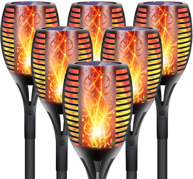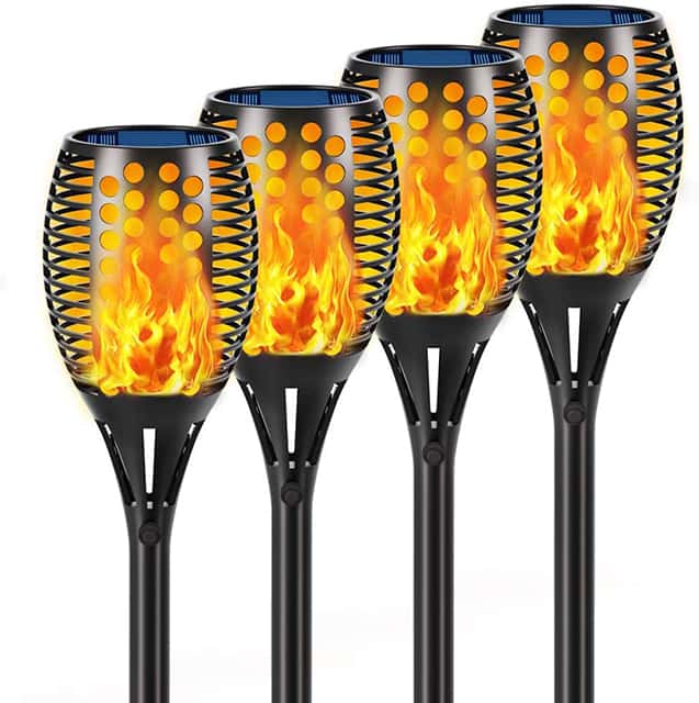 Each torch is 32.6 inches tall, but you can extend them to 43 inches if you use their special attachment. This feature recommends them for any garden with abundant vegetation that might mask shorter torches. Despite the plastic design, these torches are incredibly sturdy and durable. At the same time, they are also IP-65 water-resistant, which means that they will withstand rain and snow, as long as you avoid dust or snow buildup on the small solar panel on the top, so they keep charging.