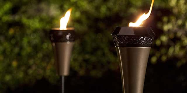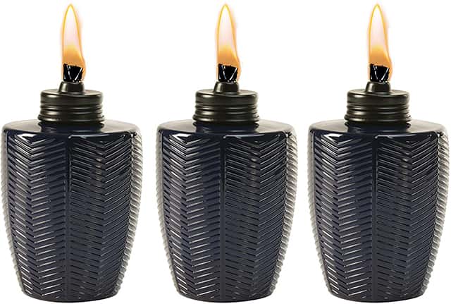 If you love the classic tiki torch, this bamboo set might be exactly what you need. The traditional design will add an exotic touch to your backyard. You can add enough oil to light up your party for up to five hours. Then, you can easily extinguish the flame with the cover when the night is over.