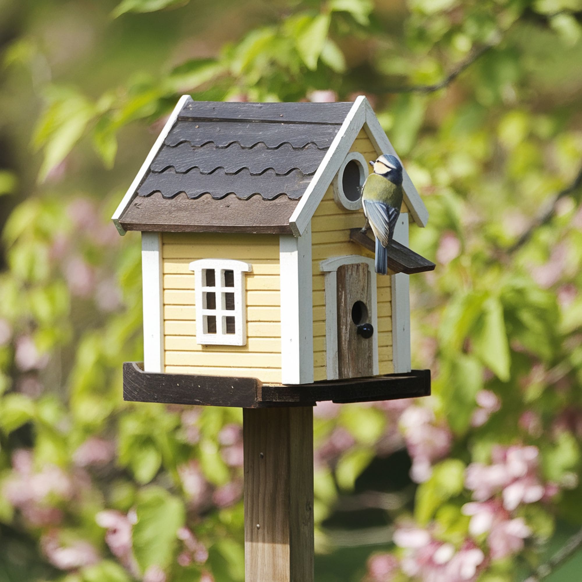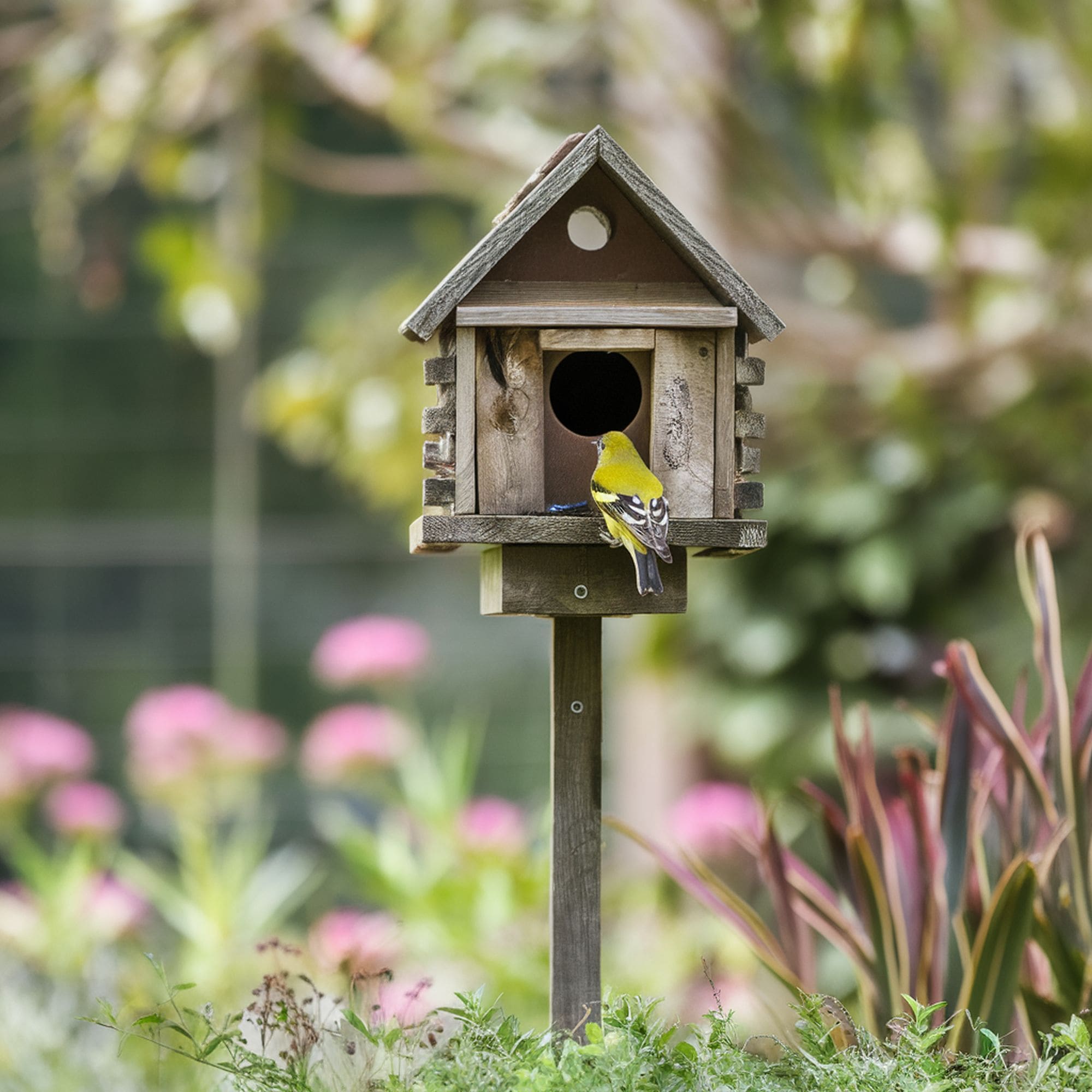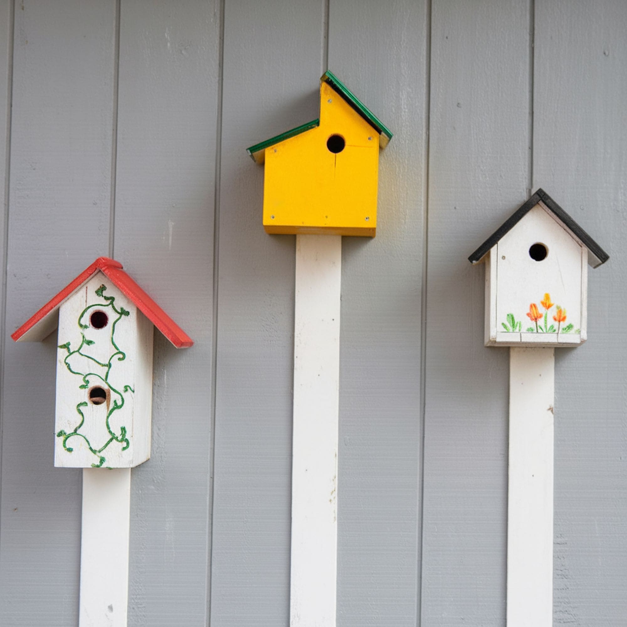 Did you know that birds are attracted by different colors? For instance, this owner decided to craft a beautiful, tiny golden cottage as a birdhouse. The yellow color is loved by numerous energetic birds, including goldfinches, warblers, and hummingbirds. You can also choose any other bright color that resembles flowers if you want to attract diverse species.