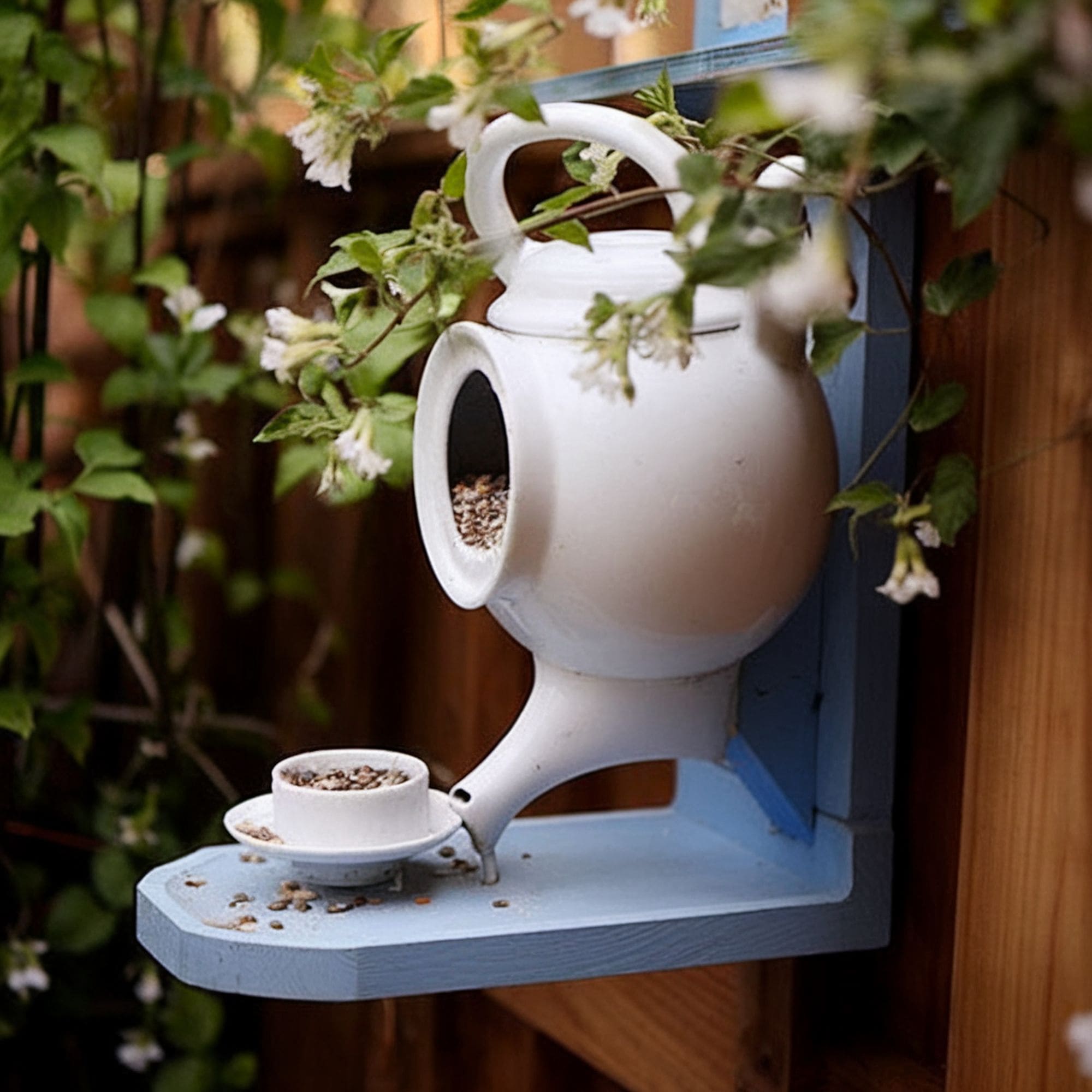 If you tend to store old items, you may find that many of them can be repurposed into a creative birdhouse. This example shows some flawless imagination – the creator decided to use an old teapot and a part of a drawer to create a birdhouse. You can also examine your storage room and find some old, unnecessary items that can be turned into a birdhouse.