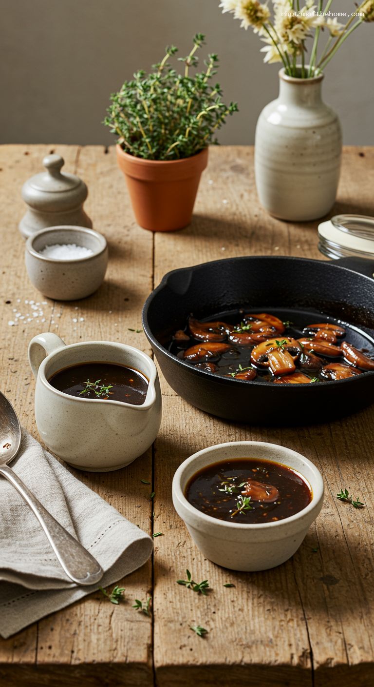 Take the pan off heat and swirl in the remaining 1 tbsp cold butter until melted for a velvety sheen. Taste and adjust: add a pinch of salt if needed, a few drops of balsamic or sherry vinegar for brightness, or a splash of stock if it’s too intense. Transfer to a warm sauce boat, small jar, or ladle straight from the skillet.