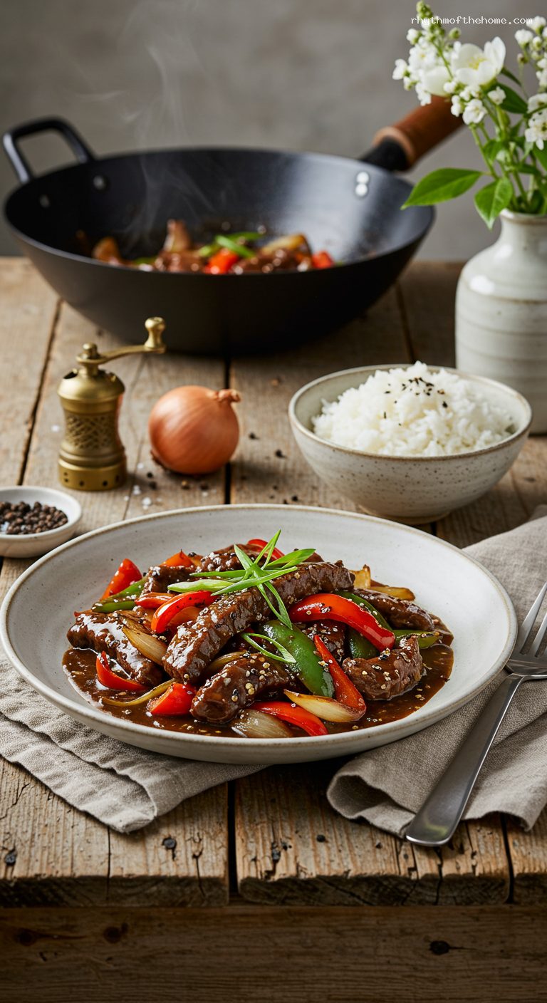 Return the beef and any juices to the wok. Stir the cornstarch slurry and add half of it; toss until the sauce is glossy and clings to the beef and vegetables, about 30–60 seconds. Add more slurry only if needed to reach a thin, nappe consistency. Toss in most of the scallions, reserving some for garnish. Serve immediately over hot jasmine rice, garnished with remaining scallions and an extra crack of black pepper if you like.