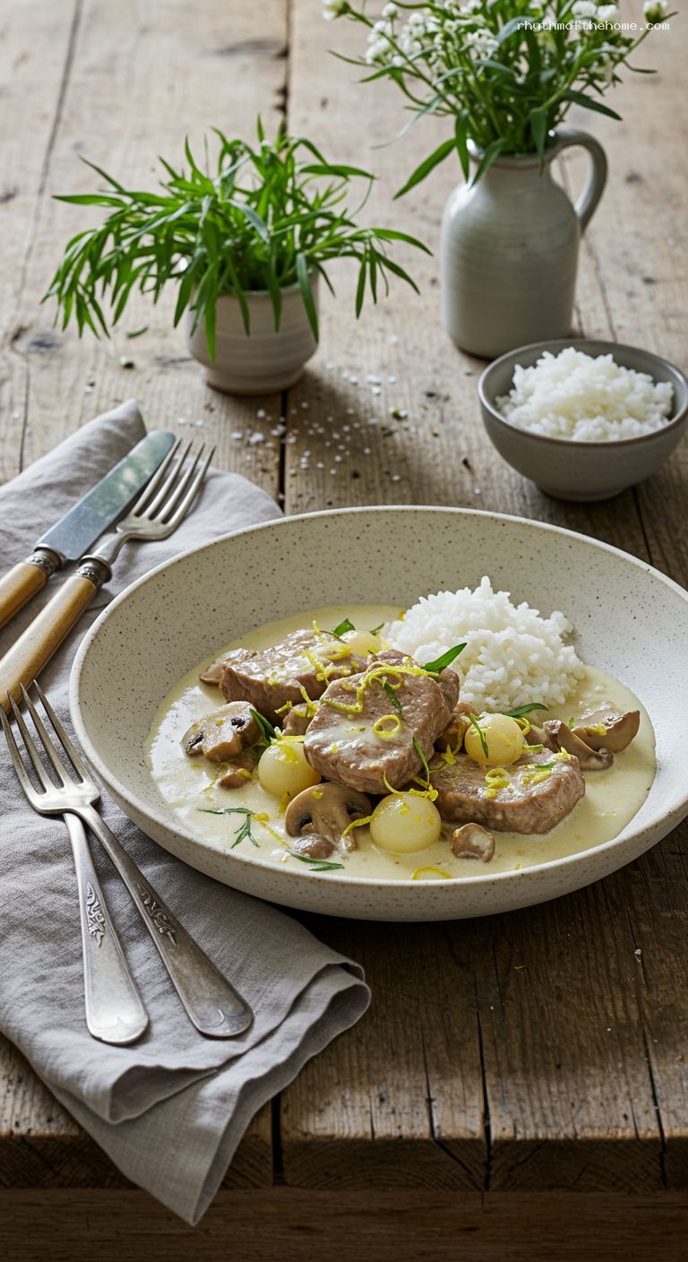 Add the warm veal, mushrooms, and glazed pearl onions to the sauce. Stir gently to coat and warm through for 3–5 minutes, keeping the sauce below a simmer. Serve immediately over hot white rice (or buttered noodles), with extra tarragon sprinkled on top.