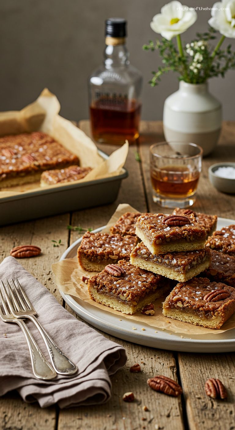 • Buttery shortbread base that stays crisp under a lush, pecan-studded filling.