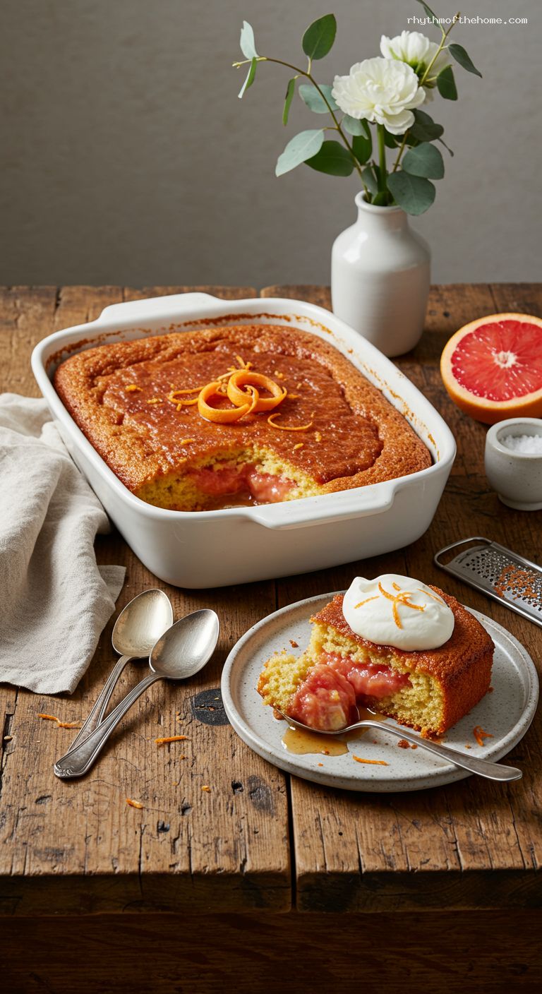 - Two dreamy layers in one bake: a fluffy brown-sugar sponge on top and a tangy grapefruit custard beneath.