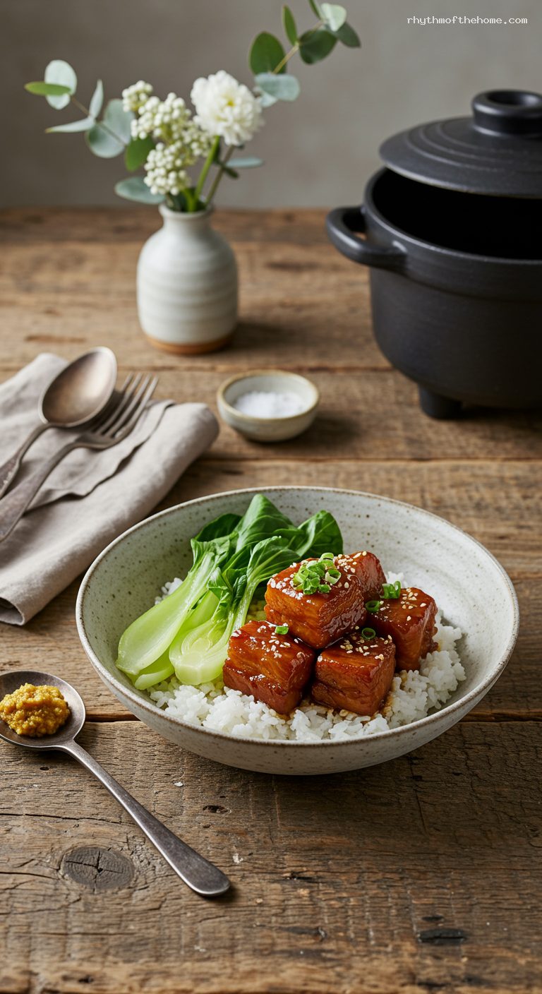 - Spoon-tender pork belly with a deep, glossy soy-sake-mirin glaze.