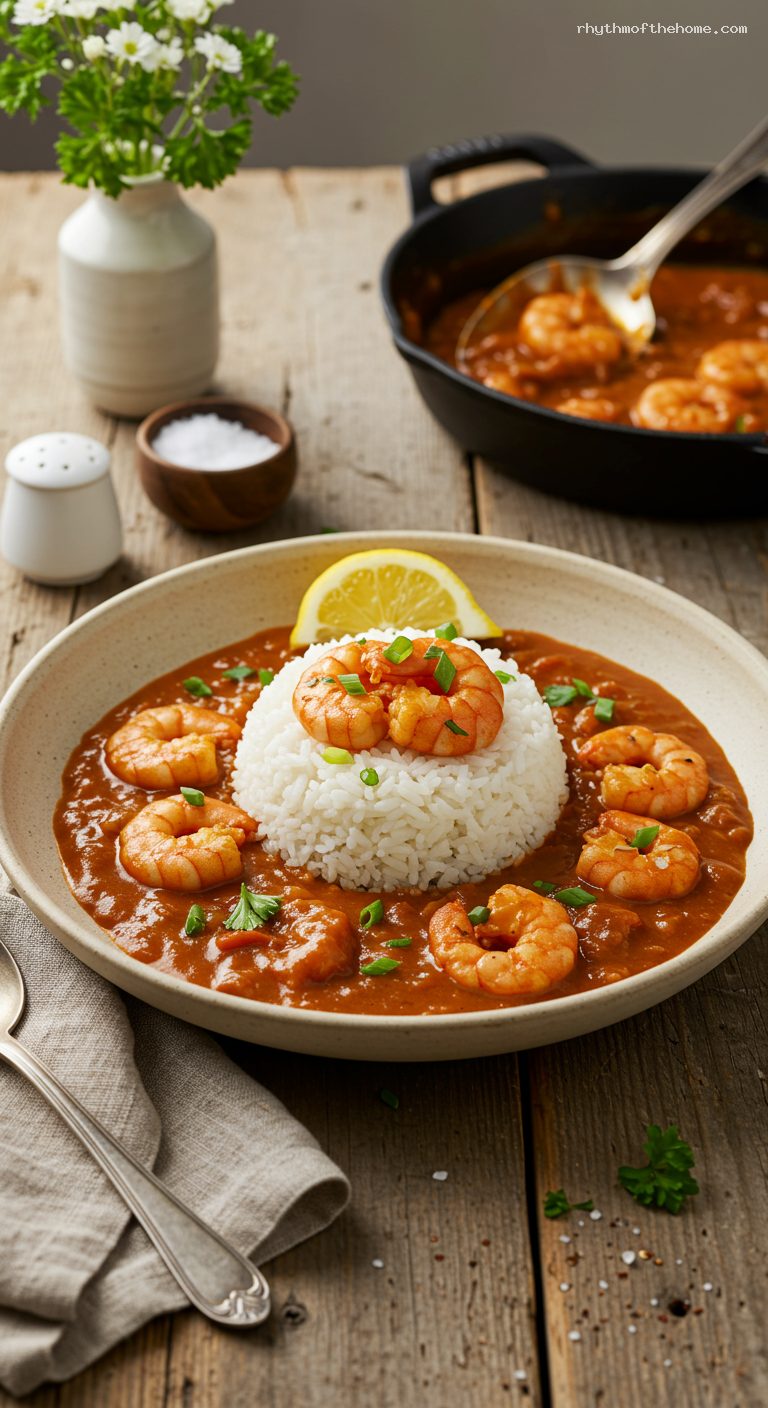 Refrigerate leftovers in an airtight container for up to 3 days. Reheat gently over low heat until steaming (about 160°F); avoid boiling to prevent overcooking the shrimp. For best make-ahead results, cook the sauce through Step 5 up to 2 days in advance, chill, then reheat and add shrimp right before serving. The finished étouffée with shrimp does not freeze well, but the sauce base (without shrimp) can be frozen up to 2 months.