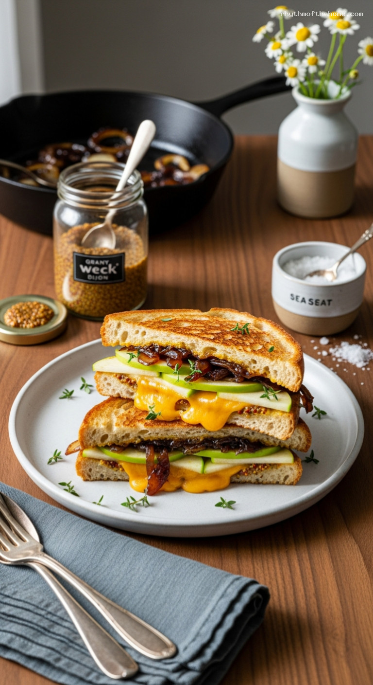 Caramelized onions can be refrigerated up to 5 days or frozen up to 2 months (thaw overnight in the fridge). Assemble sandwiches right before cooking for best texture. If you must hold sliced apples, toss with a few drops of lemon juice and pat dry before layering. Leftover cooked sandwiches can be refrigerated up to 1 day; reheat in a 350°F/175°C oven or toaster oven for 8–10 minutes, or in a covered skillet over medium-low heat 3–4 minutes per side. Avoid microwaving, which softens the crust.