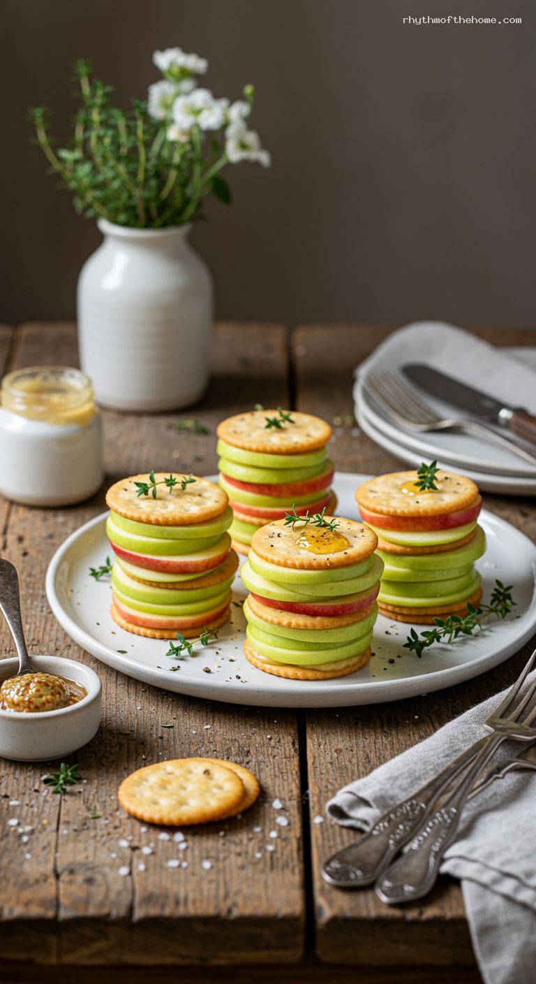 Top each prepared cracker with a slice of cheddar and then an apple slice. Add a tiny dot of honey mustard on top of the apple if you like a glossy finish. Finish with a generous grind of black pepper (total 1/2 teaspoon across all stacks). Sprinkle a pinch of flaky sea salt and thyme leaves if using.