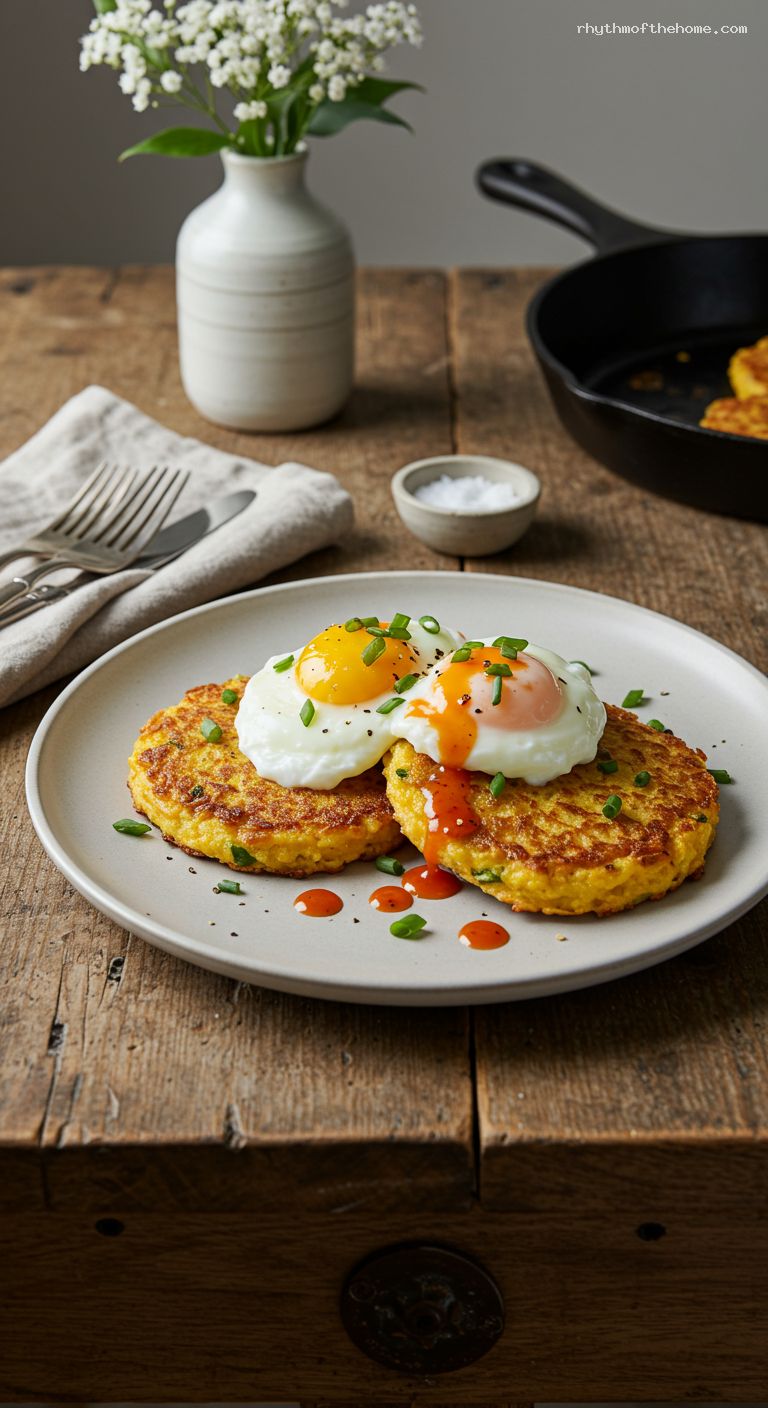 Preheat a large skillet (cast iron preferred) over medium to medium-high heat for 2 minutes. Add 2 tbsp oil; when it shimmers (about 350–375°F at the surface), lay in the cakes without crowding. Sear 3–4 minutes per side until deep golden and crisp. Add 1 tbsp butter during the last minute to boost browning. Transfer finished cakes to a sheet pan in a 250°F oven to stay hot while you cook the eggs.